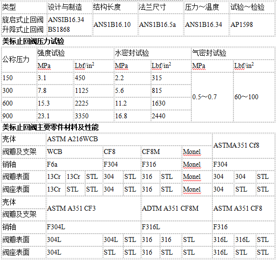 美標(biāo)止回閥又稱單向閥或逆止閥,其作用是防止管路中的介質(zhì)倒流。啟閉件靠介質(zhì)流動(dòng)和力量自行開啟或關(guān)閉,以防止介質(zhì)倒流的閥門叫止回閥。美標(biāo)止回閥屬于自動(dòng)閥類,主要用于介質(zhì)單向流動(dòng)的管道上,只允許介質(zhì)向一個(gè)方向流動(dòng),以防止發(fā)生事故。本類閥門在管道中一般應(yīng)當(dāng)水平安裝。美標(biāo)止回閥制造標(biāo)準(zhǔn):中國GB、機(jī)械部JB、化工標(biāo)準(zhǔn)HG、美標(biāo)API、ANSI、德標(biāo)DIN、日本JIS、JPI、英標(biāo)BS生產(chǎn)。閥體材質(zhì):銅、鑄鐵、鑄鋼、碳鋼、WCB、WC6、WC9、20#、25#、鍛鋼、A105、F11、F22、不銹鋼、304、304L、316、316L、鉻鉬鋼、低溫鋼、鈦合金鋼等。工作壓力1.0Mpa-50.0Mpa。工作溫度:-196℃-650℃。連接方式:內(nèi)螺紋、外螺紋、法蘭、焊接、對焊、承插焊、卡套、卡箍。驅(qū)動(dòng)方式:手動(dòng)、氣動(dòng)、液動(dòng)、電動(dòng)。